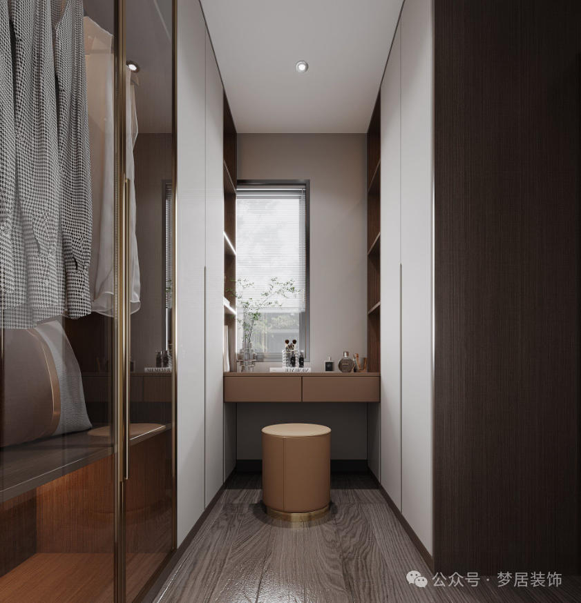 衣帽間同樣選用溫潤的木質地板,一門到頂的衣柜采用開放式與封閉式相結合的設計,部分玻璃門柜子內部安裝燈帶,空間更通透。懸浮式梳妝柜搭配淺駝色皮質化妝椅,提升空間輕奢質感。