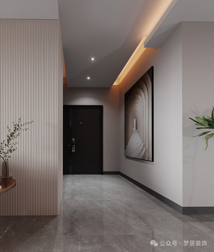 入戶玄關作為歸家的第一站,是空間氣質的初展示。摒棄了繁復的裝飾,簡約中透露著精致,細節的考究勾勒出空間的精致格調。墻上懸掛藝術裝飾畫,暖色的燈光營造出歸家的溫馨氛圍。